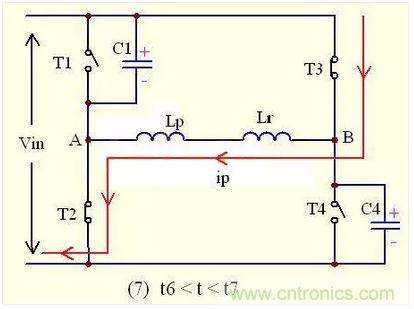 達到t6時刻之后,移相全橋的正半周期工作結束;并開始負半周期工          作,其工作原理與正半周期相似,下面來做進一步的分析: