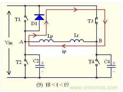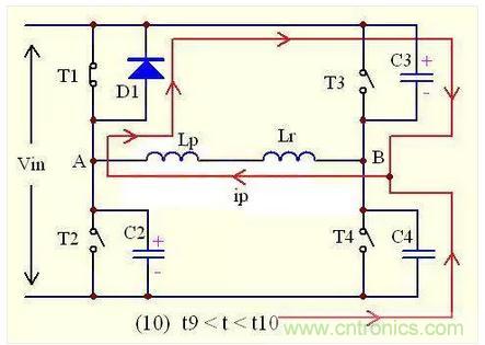 由于T3的關斷,原邊電流ip突然失去通路,但由電感的原理我們知道,原邊電流不允許突變,需要維持原來的方向,以一定的速率減少。所以,原邊電流ip會對C3充電,使C3兩端的電壓慢慢往上升,同時C4開始放電。即 ip(t)=-I2sinω(t-t9)