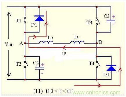 如圖所示,在t11時刻之前,T4已經導通,在t11時刻原邊電流ip已經上升到0,由于沒有了電流,所以D1,D4自然關斷。