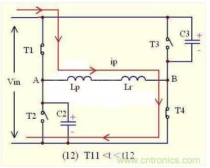 在t11-t12的時間內,副邊的二極管D1,D2還是同時導通流過電流,將副邊繞組短路,阻斷輸出電感反射到初級的途徑,此時的負載電流還是由次級電感與輸出電容提供;同時,由于原邊的T1,T4已經導通,原邊電流ip流過T1--Lr—T4,又因為Lr很小,所以原邊電流ip就會正向急劇增大。