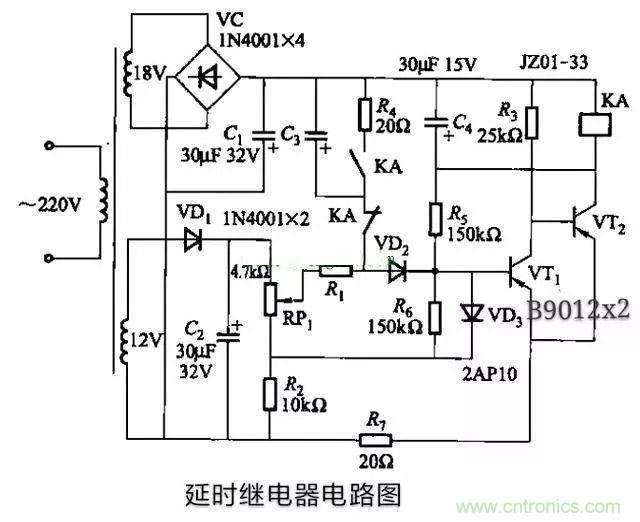 它工作使用一微型變壓器降壓,初級輸入電源為AC交流220Ⅴ,次級有二組電源AC18Ⅴ AC12Ⅴ,AC18V經橋式整流二極管(1N4001×4),C1(30uf/32V)濾波后,為kA微型繼電器、復合三極管ⅤT1 ⅤT2(9012)提供直流DC工作電源。另一組AC交流12Ⅴ電經vD1半波整流,C2電解電容濾波,供給調整充電時間專用可變電位器RP1,C3為一獨石電容,其工作特性較好而用于延時充放電電路中。圖中有JZ01一33繼電器的kA常開和一組kA常閉觸頭,它們在電路中主要作用就是上面給大家說的,通電、斷電延時繼電器在完成預置時間后恢復原始狀態,進行下一步工作做好準備。