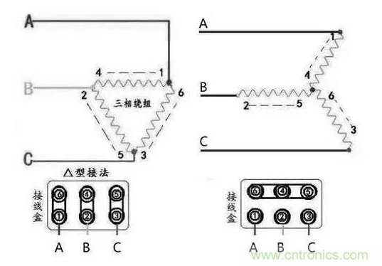 首先我們看下電機的內部繞組,三相異步電機內部有三個繞組,有星和三角形兩種接法。