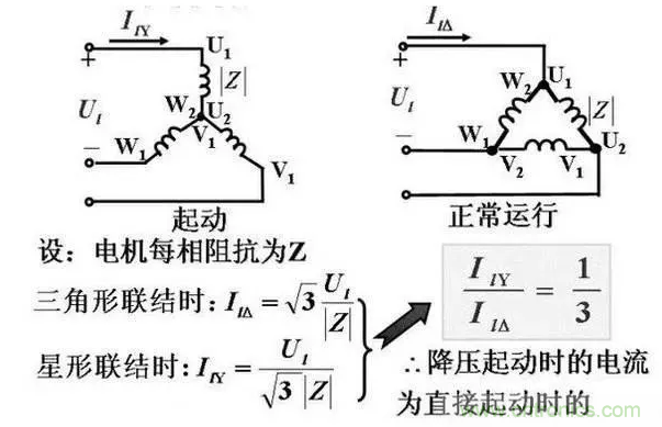 做星三角啟動的電機有兩個重要的特性:星型啟動電流和啟動轉矩均變成額定電流的三分之一。