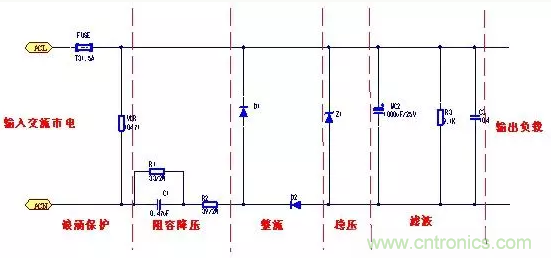 阻容降壓也是X電容經常用到的,特別對于成本低廉成品,電容降壓的工作原理是利用電容在一定的交流信號頻率下產生的容抗來限制最大工作電流。同時在電容器上串聯一個阻性元件,則阻性元件兩端所得到的電壓和它所產生的功耗完全取決于這個阻性元件的特性。因此,電容降壓實際上是利用容抗限流,而電容器實際上起到一個限制電流和動態分配電容器和負載兩端電壓的角色。如下圖