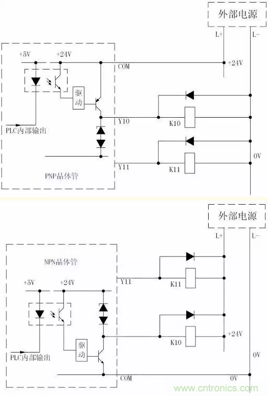 由以上兩圖可看出這兩種晶體管輸出電路形式的區(qū)別:NPN型集電極開(kāi)路輸出形式的公共端COM只能接外接電源的負(fù)極,而PNP型的COM端只能接外接電源的正極。