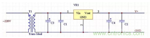 (c)元器件實物 圖F1-15 常見的三端穩壓源圖F1-16所示為常見的三端穩壓源運用電路,交流220V的電壓經變壓器T1降壓到一定范圍后,再通過C3和C1進行濾波,然后進入三端穩壓源就可得到特性較好的電壓。為了提高電壓源的穩定性,設計者還時常在穩壓源的輸出端加上濾波電容C4和C2。