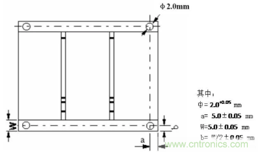 在拼板外框的四角開出四個(gè)定位孔,孔徑4mm±0.01mm;孔的強(qiáng)度要適中,保證在上下板過程中不會(huì)斷裂;孔徑及位置精度要高,孔壁光滑無毛刺。