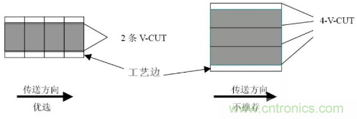 拼板方向應(yīng)平行傳送邊方向設(shè)計(jì), 當(dāng)尺寸不能滿足上述拼版尺寸要求的例外。一般要求“V-CUT”或郵票孔線數(shù)量≤3(對(duì)于細(xì)長(zhǎng)的單板可以例外),見圖3.4。