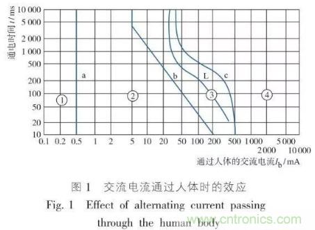 圖1示出了交流電流通過人體時的效應,圖中的曲線c是IEC測試得出的導致心室纖顫的曲線,曲線的橫坐標是通過人體的15 ~ 100 Hz交流電流Ib,縱坐標表示通電時間t。當通過人體電流大小在曲線c的右側區域時,不僅會出現肌肉收縮、呼吸困難、心房纖顫等病理反應,還會出現導致死亡的心室纖顫、心室停搏、呼吸停止等反應。也就是說通過人體的電流和通電的持續時間在c曲線的右側即在 ④ 區內,人體就有死亡的危險。另外曲線c是在實驗室所指定的外界條件下測定和繪制,由于實驗室所指定的外界條件可能與室外的條件有所不同,應為室外條件的變化留出一些余量,因此以在區域 ③ 內距離曲線c一段距離的曲線L作為人體是否安全的界限。查曲線L可知,當Ib < 30 mA時,人體就不會因電擊引起心室纖顫而致死。這就是國際上將防電擊的高靈敏度剩余電流動作保護裝置RCD的額定剩余動作電流IΔn定為30 mA的根據。