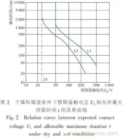 當電流Ib通過人體阻抗為Zs時,會產生電壓Ut,電壓Ut稱為接觸電壓,電流Ib是接觸電流,Ib越大,接觸電壓Ut也越大。實際工作時,計算Ib較困難,而計算接觸電壓比較方便,于是IEC又提出在干燥和潮濕環境條件下相應的預期接觸電壓Ut―通電時間t的曲線L1和L2(如圖2所示),這里預期的接觸電壓是最大的接觸電壓,為確保電氣安全和簡化計算,在實際應用中,接觸電壓都采用預期接觸電壓。