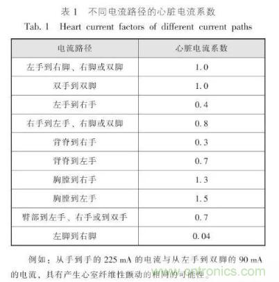 以上所述電擊電流通過人體的通道環境是在地面上,接觸電流經手、腳和不同電位導體接觸,有可能經心臟引發電擊事故。表1是不同電流路徑的心臟電流系數,引自GB / T 13870. 1 - 2008 / IEC / TS 60479 - 1:2005《電流對人和家畜的效應 第1部分:通用部分》表12。