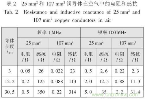 表2是電阻及電抗隨工作頻率變化而變化的關系。由表2可知:對于同一截面(如25 mm2)的銅導體在高頻1 MHz時,其感抗量為電阻量的625倍;頻率為100 MHz時,兩者的倍數高達6 250。當導體截面增大為107 mm2、頻率為1 MHz時,其感抗量為電阻量的1 284倍;頻率為100 MHz時,兩者的倍數高達12 840。