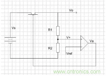 現在我們來看Vo是怎么穩定的,假設Vo變小,那么V+將變小,放大器的輸出Va也將變小,這將導致MOSFET的阻抗變小,這樣經過同樣的電流,MOSFET的壓差將變小,于是將Vo上抬來抑制Vo的變小。同理,Vo變大,V+變大,Va變大,MOSFET的阻抗變大,經過同樣的電流,MOSFET的壓差變大,于是抑制Vo變大。