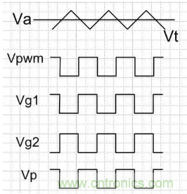 誤差放大器的正端Vref是一恒定的電壓,而PWM放大器的負端Vt是一個三角波信號,一旦Va比三角波大時,Vpwm為高;Va比三角波小時,Vpwm為低,因此Va與三角波的關系,決定了方波信號Vpwm的占空比;Va高,占空比就低,Va低,占空比就高。經過處理,Vg1與Vpwm同相,Vg2與Vpwm反相;最終L左端的方波電壓Vp與Vg1相同。如下圖