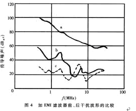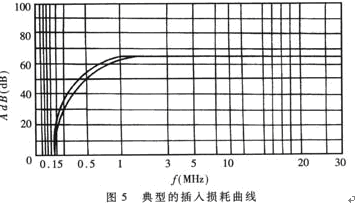 圖5給出一條典型曲線。由圖可見,該產品可將1MHz~30MHz的噪聲電壓衰減65dB。