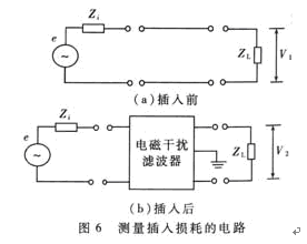 e是噪聲信號發生器,Zi是信號源的內部阻抗,ZL是負載阻抗,一般取50Ω。噪聲頻率范圍可選10kHz~30MHz。首先要在不同頻率下分別測出插入前后負載上的噪聲壓降V1、V2,再代入(2)式中計算出每個頻率點的AdB值,最后繪出插入損耗曲線。需要指出,上述測試方法比較煩瑣,每次都要拆裝EMI濾波器。為此可用電子開關對兩種測試電路進行快速切換。