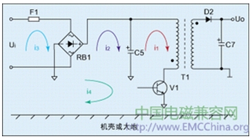 圖1中,當電源開關管V1導通或者關斷時,在電容器C5、變壓器T1的初級和電源開關管V1組成的電路中會產生脈動直流i1,如果把此電流回路看成是一個變壓器的“初級線圈”,由于電流i1的變化速率很高,它在“初級線圈”中產生的電磁感應,也會對周圍電路產生電磁感應,我們可以把周圍電路都看成是同一變壓器的多個“次級線圈”,同時變壓器T1的漏感也同樣對各個“次級線圈”產生感應作用,因此電流i1通過電磁感應,在每個“次級線圈”中都會產生的感應電流,我們分別把它們記為i2、i3、i4 •••。