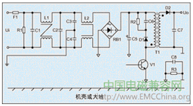 其中i2和i3是差模干擾信號,它們可以通過兩根電源線傳導到電網的其它線路之中和干擾其它電子設備;i4是共模干擾信號,它是電流i1回路通過電磁感應其它電路與大地或機殼組成的回路產生的,并且其它電路與大地或機殼是通過電容耦合構成回路的,共模干擾信號可以通過電源線與大地傳導到電網其它線路之中和干擾其它電子設備。