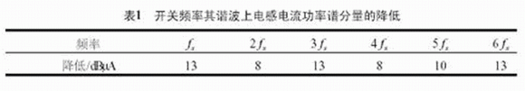 仿真結(jié)果如圖5所示,為了便于同EMC標(biāo)準(zhǔn)對(duì)照,電流功率譜采用對(duì)數(shù)表示。在開(kāi)關(guān)頻率fs及各次諧波上電流的減小如表1所示。