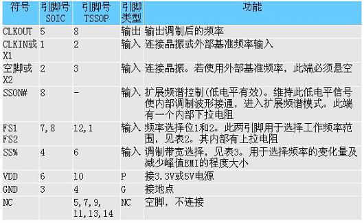 在擴(kuò)展頻譜時(shí)鐘發(fā)生中,EMI減弱要依靠整形、調(diào)制率和調(diào)制波形的頻率。當(dāng)整形及調(diào)制波形的頻率由已定的頻率來確定時(shí),調(diào)制的百分比就會(huì)有所不同。使用頻率選擇位(FS1及FS2)能設(shè)置頻率范圍。擴(kuò)展率也被設(shè)到-1.25%之間。見表2。高擴(kuò)展率加強(qiáng)了對(duì)EMI的減弱,然而,高擴(kuò)展率卻可能會(huì)因?yàn)槌^系統(tǒng)最大額定頻率或低于平均頻率而使性能受到影響。鑒于上述原因,擴(kuò)展率多在0.5%--2.5%之間。