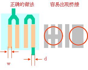 5.如果相鄰的焊盤需要相連,首先確認在外面進行連接,防止連成一團造成橋接,同時注意此時的銅線的寬度。