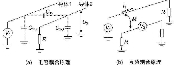 當(dāng)一根導(dǎo)線上存在電壓或有電流流過(guò)時(shí), 就會(huì)有電磁能量輻射出來(lái), 到達(dá)附近的導(dǎo)線上, 這就是導(dǎo)線之間的串?dāng)_。串?dāng)_屬于近場(chǎng)的感應(yīng)耦合, 原因是導(dǎo)線之間存在雜散電容和互感, 即電容耦合和互感耦合, 如圖1 所示。