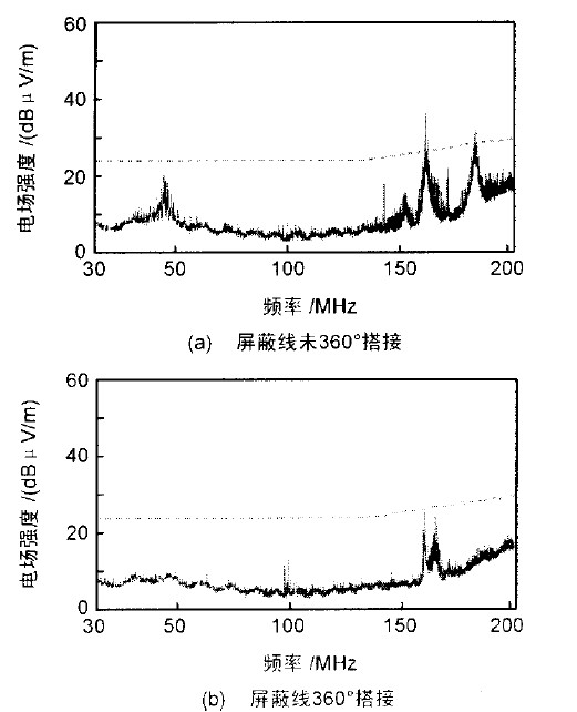 減小空間輻射測(cè)試曲線如圖4 所示。圖4(a)是一臺(tái)外接屏蔽電纜的設(shè)備的測(cè)試曲線,電纜與接口連接器相連的地方都是將屏蔽層擰成一條小辮(又稱Pigtail),然后固定到連接器的螺釘上。屏蔽電纜能控制共模輻射是因?yàn)楣材k娏魈峁┝艘粋€(gè)低阻抗通路,使共模電流通過(guò)屏蔽層流回共模電壓源。電纜屏蔽層提供的共模電流通路的阻抗由電纜本身的阻抗及電纜與金屬機(jī)箱之間的搭接阻抗2 部分組成。因?yàn)殡娎|與金屬機(jī)箱之間的搭接阻抗(Pigtail的阻抗)較大,這就使得屏蔽層上形成了一個(gè)較大的共模電壓,在該電壓的驅(qū)動(dòng)下,電纜屏蔽層上會(huì)產(chǎn)生共模電流,因而屏蔽層變成了天線向外輻射。將Pigtail連接改成360 壓接在連接器的金屬外殼上,保證低阻抗搭接,測(cè)試結(jié)果如圖4(b)所示。