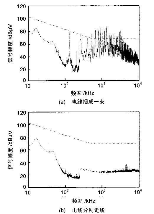 減小電容耦合和互感耦合測(cè)試曲線如圖3 所示。因?yàn)殡娙蓠詈虾突ジ旭詈系拇嬖冢?jīng)常出現(xiàn)圖3(a)這樣的測(cè)試結(jié)果。這是因?yàn)殡娫淳€濾波器的輸入輸出線捆成一束,濾波器輸出線上的雜波電流直接通過(guò)電容和互感耦合到輸入線上,使濾波器形同虛設(shè)。解決這一問(wèn)題只需將濾波器的輸入輸出線分別截短并盡可能遠(yuǎn)離,保持一定角度,并將線固定在機(jī)箱殼體上,這樣就使得輸入線輸出線上的干擾電流不能直接耦合,電源線經(jīng)過(guò)濾波器后干擾電流得到抑制。