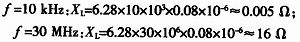 當(dāng)一段導(dǎo)線與其他導(dǎo)線遠(yuǎn)離并且其長度遠(yuǎn)大于寬度時,導(dǎo)線的自感量為0.8 μH/m,那么10 cm長的導(dǎo)線的電感量是0.08μH。再由下面的公式求出導(dǎo)線感抗:XL=2πfL,下式中,f為導(dǎo)線通過信號的頻率(Hz),L為單位長度導(dǎo)線的自感量(H)。所以分別計算出該導(dǎo)線在低頻和高頻下的感抗值: