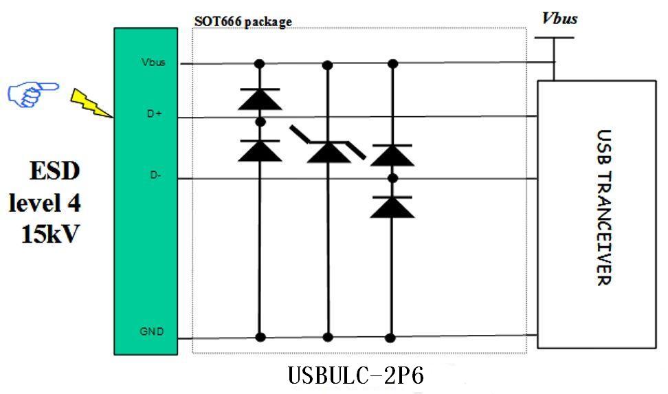 除保護(hù)兩條數(shù)據(jù)線路外,還必須保護(hù)Vbus線路。這是這個(gè)特殊的保護(hù)器件的另一個(gè)增值之處,因?yàn)樗Wo(hù)D+、D-和Vbus三條線路。專用的TVS二極管在相同的條件下像保護(hù)數(shù)據(jù)線路一樣保護(hù)Vbus線路,防護(hù)ESD浪涌。
