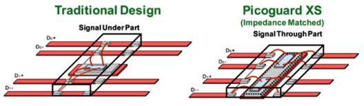 另一類是采用PicoGuard® XS技術的產品。這種類型設計使用阻抗匹配(Impedance Matched)電路,可保證100 Ω的阻抗,相當于電容為零。這類設計無需并聯(lián)電感,有助于最大限度地減少封裝引起的ESD電壓尖峰。