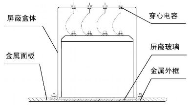 儀表窗口對設備來說是比較大的泄漏口,必須采取有效的措施將其屏蔽,為此采用加裝絲網(wǎng)屏蔽玻璃的方法對數(shù)字電流表、數(shù)字電壓表進行外部屏蔽。絲網(wǎng)屏蔽玻璃是由一種低阻抗的金屬絲網(wǎng)通過特殊工藝夾在兩層玻璃之間制成,絲網(wǎng)篩孔的密度決定其主要的屏蔽效能。如圖1 所示,由于玻璃周邊預留了10~ 20 mm 金屬絲網(wǎng)毛邊,通過螺裝金屬外框?qū)⑺o緊壓在機箱上,從而獲得連續(xù)的導電表面,以達到減少電磁泄露的目的。
