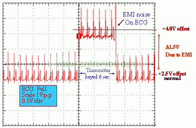 圖 1    1.5 英尺以外的發射器(f = 470 MHz, P= 0.5W)開啟和關閉時 ECG 診斷設備的心臟檢查結果