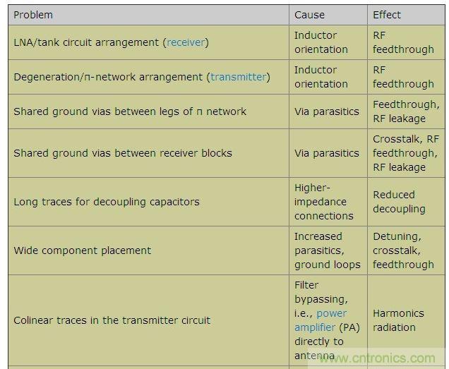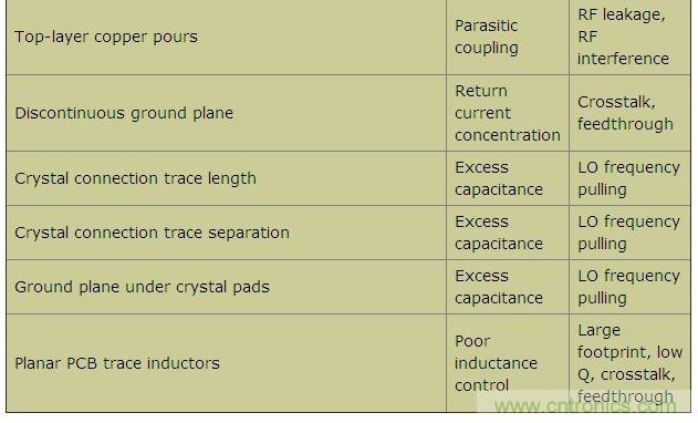 本文羅列了各種不同的設(shè)計(jì)疏忽,探討了每種失誤導(dǎo)致電路故障的原因,并給出了如何避免這些設(shè)計(jì)缺陷的建議。本文以FR-4電介質(zhì)、厚度0.0625in的雙層PCB為例,電路板底層接地。工作頻率介于315MHz到915MHz之間的不同頻段,Tx和Rx功率介于-120dBm至+13dBm之間。表1列出了一些可能出現(xiàn)的PCB布局問題、原因及其影響。