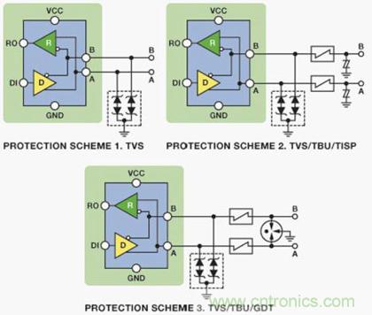 電路保護(hù)元件,針對(duì)ADI公司具有增強(qiáng)ESD保護(hù)性能的ADM3485E 3.3 V RS-485收發(fā)器提供不同的成本/保護(hù)級(jí)別。所用的Bourns外部電路保護(hù)元件包括瞬態(tài)電壓抑制器(CDSOT23-SM712)、瞬態(tài)閉鎖單元(TBU-CA065-200-WH)、晶閘管電涌保護(hù)器(TISP4240M3BJR-S)和氣體放電管(2038-15-SM-RPLF)。