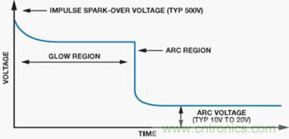 圖9顯示GDT的典型特性。當(dāng)GDT兩端的電壓增大時(shí),放電管中的氣體由于產(chǎn)生的電荷開始電離。這稱為輝光區(qū)。在此區(qū)域中,增加的電流將產(chǎn)生雪崩效應(yīng),將GDT轉(zhuǎn)換為虛擬短路,允許電流通過器件。在短路事件中,器件兩端產(chǎn)生的電壓稱為弧電壓。輝光區(qū)和電弧區(qū)之間的轉(zhuǎn)換時(shí)間主要取決于器件的物理特性。
