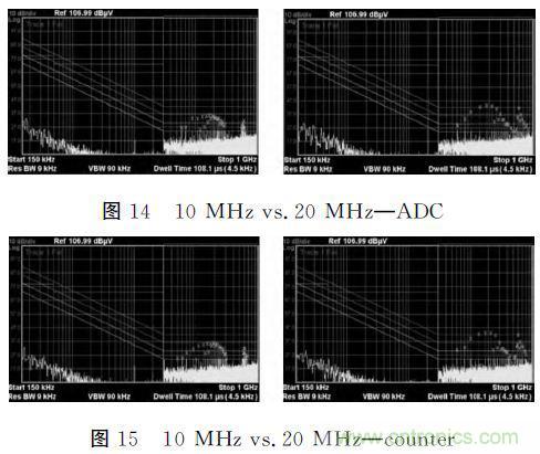 ①從電源端口結(jié)果來看,區(qū)別很小,下面以VDD1為例進(jìn)行分析說明。VDD1測試選取了ADC和counter(數(shù)字計(jì)數(shù)器)的程序,以比較不同類別的程序?qū)?shù)字供電是否有影響,測試結(jié)果如圖14、圖15所示。