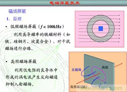 高電導率材料制成的屏蔽物對低頻磁場的屏蔽效果比較差。例如,在工頻50赫時,銅的貫穿深度約為9.4毫米,薄壁銅殼的屏蔽作用很小。在實際應用中,常采用靜磁屏蔽措施來屏蔽低頻磁場。電磁屏蔽物接地后也可以屏蔽靜電干擾。電磁屏蔽物上不能隨意開縫,因為電磁屏蔽還利用了渦電流的作用,若縫隙割斷了渦電流的通路,屏蔽效果要降低。