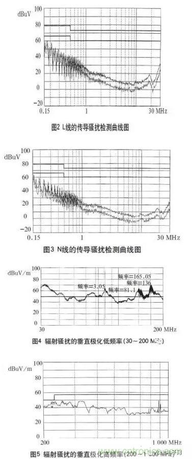 在3m法電波暗室對(duì)試驗(yàn)樣機(jī)進(jìn)行測(cè)試,其L、N線(xiàn)的傳導(dǎo)騷擾檢測(cè)曲線(xiàn)如圖2、3所示,輻射騷擾的垂直極化掃描曲線(xiàn)如圖4、5所示。