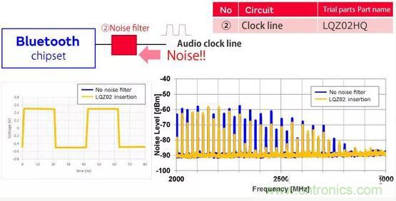 第一個區域是電源線,第二個區域是時鐘線。由于電源線由于切換而產生更高的諧波,并且時鐘信號的高次諧波延伸到2.4GHz頻帶,因此在藍牙信號中產生噪聲。濾波是抑制噪聲傳導的有效方法。