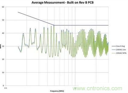 我通過簡單調整電路板(無電路變化),將噪聲降低了大約 6dB。見圖 2 和圖 3 的測量結果。在有些情況下,接近高 dV/dt 進行輸入線路布線甚至還可擊壞共模線圈 (CMC)。
