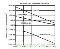 下圖比較了ADI的ADuM1100(磁隔離)和TI 的ISO72x(電容式隔離)的磁場抗擾度,雖然兩個例子在限定磁場下都不太受磁場影響,但ISO72x對磁場抗擾度有更好的表現(xiàn)。