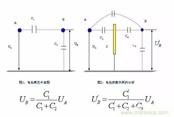 如圖對照:輸入和輸出的電場干擾可以通過電容傳輸耦合,若增加屏蔽板,則增加了C4的大小,并且C1也會減小,對電場干擾起到衰減的目的;