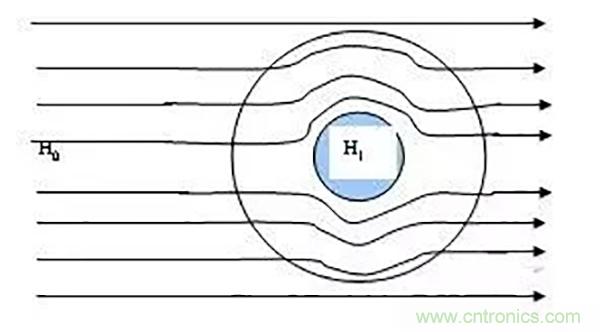 磁場屏蔽原理,磁場通過屏蔽罩會改變磁路,導(dǎo)致磁力線向周圍擴散,中間磁場干擾達到屏蔽目的;