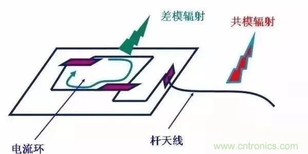 這個圖可能有些抽象,不過正好EMC是很難做到具體,需要給到我們一些啟示,可知:差模輻射是以環(huán)路的形式存在,而共模輻射是以天線的形式發(fā)射;因此正好印證前面說我們布板的時候開關(guān)環(huán)路的布局以及走線的時候不要走銳角,常規(guī)走45度,最好是圓弧走線,當然走線效率會比較低;