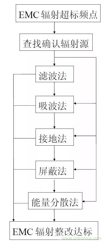 EMC 整改六步法如下:第一步查找確認輻射源,第二步濾波,第三步吸波,第四步接地,第五步屏蔽,第六步能量分散法。具體思路如下圖所示: