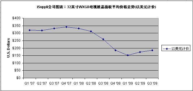 附圖所示為iSuppli公司對于2008年10月至2009年第四季度結(jié)束時32英寸WXGA TV LCD面板市場的價格預(yù)估。這種面板價格可以體現(xiàn)出整體市場趨勢。