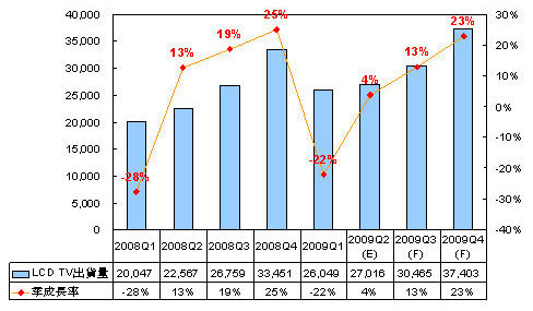 2008年第一季~2009年第四季全球LCD TV季出貨量(來(lái)源:拓墣產(chǎn)業(yè)研究所,2009/06)