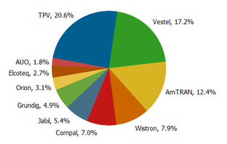 從代工廠商排名來(lái)看,TPV主要客戶有Vizio、AOC以及Philips,第一季市占率為20.6%排名居首;Vestel以17.2%市占率居次,而其主要生產(chǎn)供貨給自有品牌、白牌業(yè)者以及賣場(chǎng)品牌機(jī)種;第三名代工廠商為AmTRAN,第一季市占率12.4%,該公司主要客戶為Vizio。同時(shí)隨著中國(guó)液晶電視出貨對(duì)全球液晶電視市場(chǎng)日益重要,以及國(guó)內(nèi)品牌廠商市占率超過(guò)海外品牌廠商,DisplaySearch在每季度報(bào)告中均包括有中國(guó)電視廠商供應(yīng)鏈的詳細(xì)分析,對(duì)關(guān)心中國(guó)市場(chǎng)的客戶是一份相當(dāng)值得參考的資料。