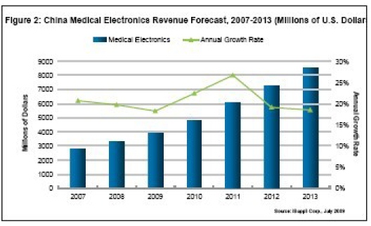 - 2009 年中國醫療電子設備銷售額將增長18.2%,從2008 年的33 億美元增長到39 億美